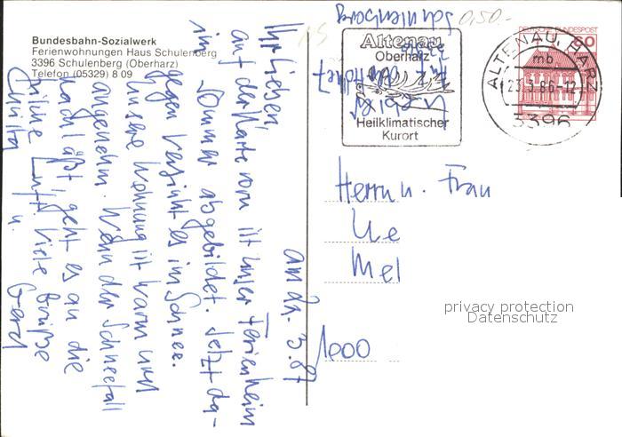 72348308 alte Postkarte Schulenberg Oberharz Bundesbahn-Sozialwerk Ferienwohnungen postalisch gelaufen Erhaltung siehe scans KatCode: 11110003153011