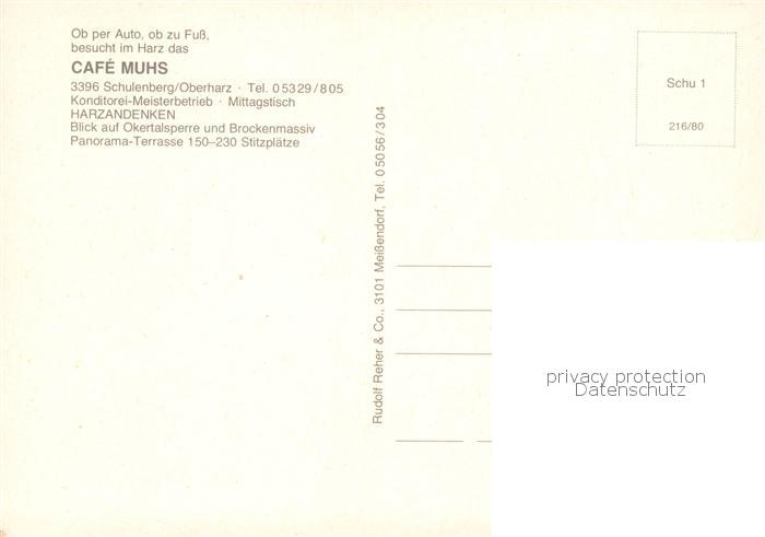 73843617 Schulenberg Oberharz Cafe Muhs postalisch nicht gelaufen Erhaltung siehe scans [WerneD78] KatCode: 11110003153011