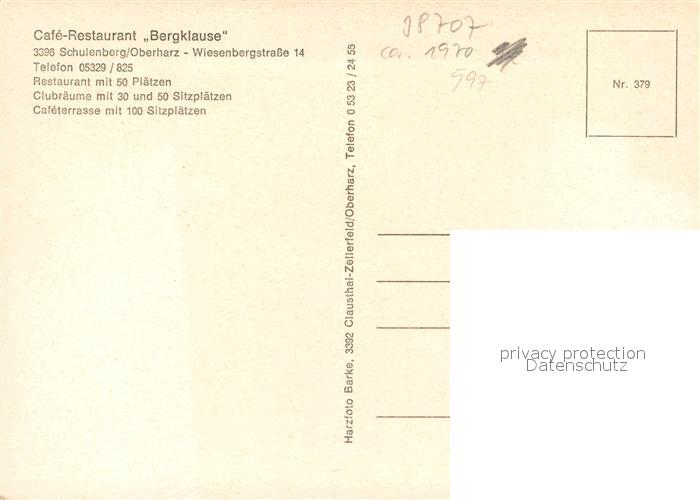 73569211 Schulenberg Oberharz Cafe Restaurant Bergklause Terrasse Landschaftspanorama Okertalsperre postalisch nicht gelaufen Erhaltung siehe scans [FriedD77] KatCode: 11110003153011