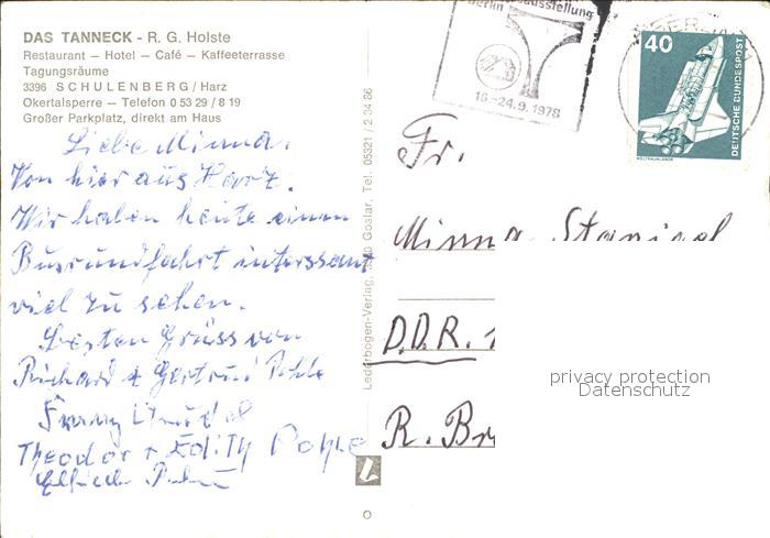 72315231 alte Postkarte Schulenberg Oberharz Hotel Cafe Tanneck Terrasse postalisch gelaufen Erhaltung siehe scans KatCode: 11110003153011