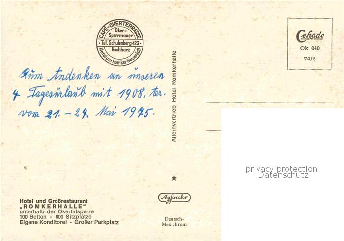 72878779 Schulenberg Oberharz Hotel Restaurant Romkerhalle an der Okertalspere postalisch nicht gelaufen Erhaltung siehe scans [FriedD77] KatCode: 11110003153011