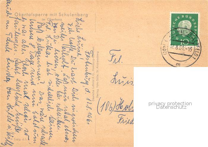 73646646 alte Postkarte Schulenberg Oberharz Okertalsperre Fliegeraufnahme postalisch gelaufen Erhaltung siehe scans [FriedD77] KatCode: 11110003153011