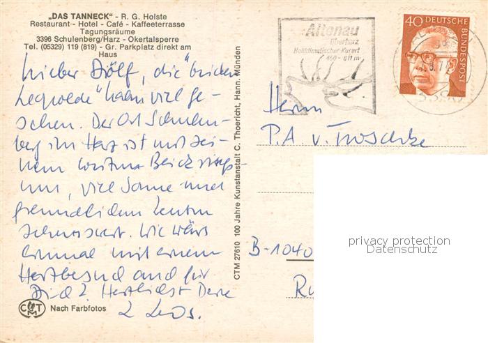 73770061 alte Postkarte Schulenberg Oberharz Restaurant Das Tanneck Hotel Gastraeume Okertalsperre postalisch gelaufen Erhaltung siehe scans [WerneD78] KatCode: 11110003153011