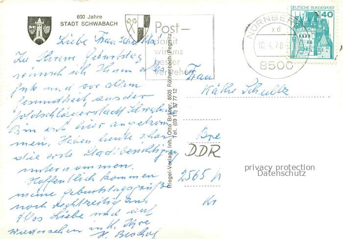 74036455 alte Postkarte Schwabach Bayern St. Sebald-Kirche Koenigsplatz Spitalberg Marktplatz Brunnen Schillerplatz postalisch gelaufen Erhaltung siehe scans [FriedD77] KatCode: 11110009565000