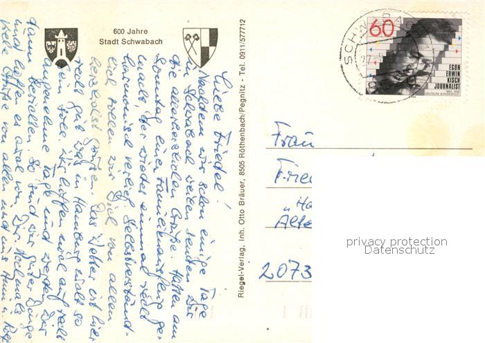73270537 alte Postkarte Schwabach Burg Schoener Brunnen Kirche Schwanenteich Strassenpartie Alte Linde postalisch gelaufen Erhaltung siehe scans [WerneD78] KatCode: 11110009565000
