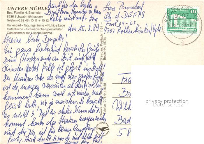 73543568 alte Postkarte Schwabmuehlhausen Untere Muehle Gastraeume Park postalisch gelaufen Erhaltung siehe scans [WerneD78] KatCode: 11110009772170