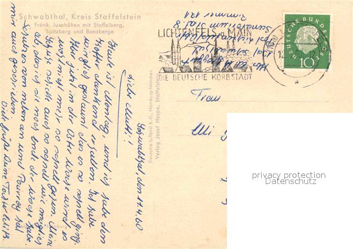 72885193 alte Postkarte Schwabthal Fraaenk Jurahoehen mit Staffelberg postalisch gelaufen Erhaltung siehe scans [WerneD78] KatCode: 11110009478165