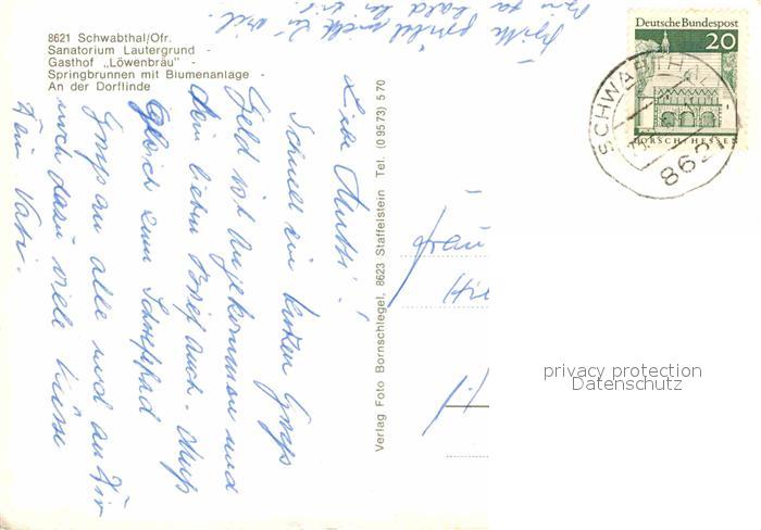 72626443 alte Postkarte Schwabthal Sanatorium Lautergrund Gasthof Loewenbraeu Springbrunnen Blumenanlage Dorflinde postalisch gelaufen Erhaltung siehe scans [FriedD77] KatCode: 11110009478165