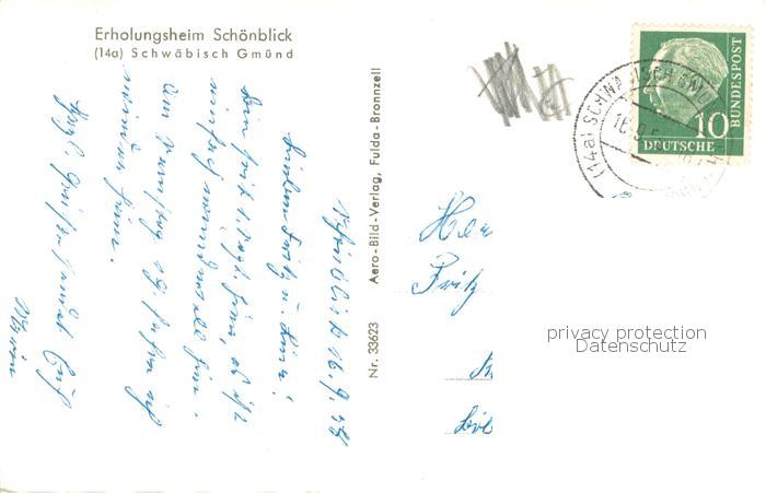 73761801 alte Postkarte Schwaebisch Gmuend Erholungsheim Schoenblick postalisch gelaufen Erhaltung siehe scans [FriedD77] KatCode: 11110008136065