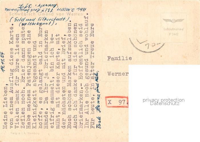 73648459 alte Postkarte Schwaebisch Gmuend Fliegeraufnahme postalisch gelaufen Erhaltung siehe scans [WerneD78] KatCode: 11110008136065