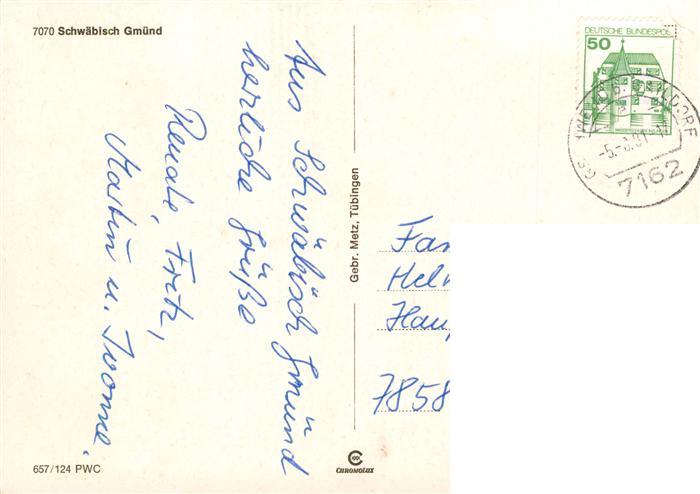 73915472 alte Postkarte Schwaebisch Gmuend Heiligkreuzmuenster Marktplatz Madonnen Brunnen Ortspartie postalisch gelaufen Erhaltung siehe scans [FriedD77] KatCode: 11110008136065