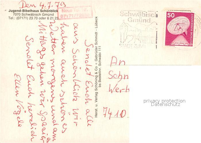 73087345 alte Postkarte Schwaebisch Gmuend Jugend-Bibelhaus Schoenblick postalisch gelaufen Erhaltung siehe scans [PaolaD17] KatCode: 11110008136065