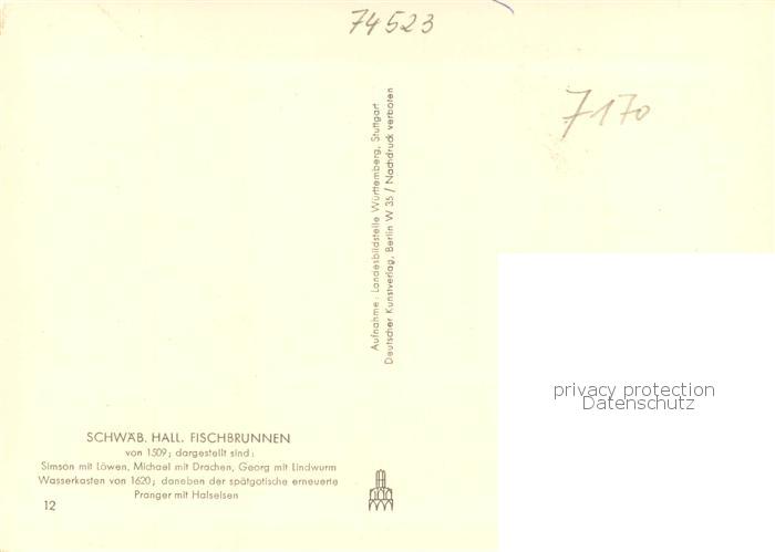 73765175 Schwaebisch Hall Fischbrunnen Simson mit Loewen Michael mit Drachen postalisch nicht gelaufen Erhaltung siehe scans [FriedD77] KatCode: 11110008127076