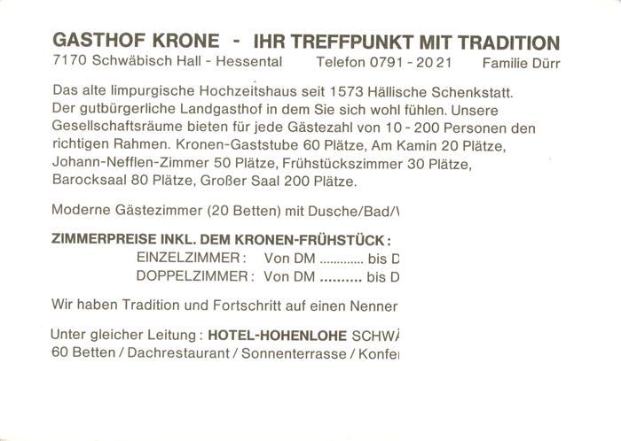 73879758 Schwaebisch Hall Gasthof Krone Gastraeume postalisch nicht gelaufen Werbekarte (keine Postkarte) Erhaltung siehe scans [WerneD78] KatCode: 11110008127076