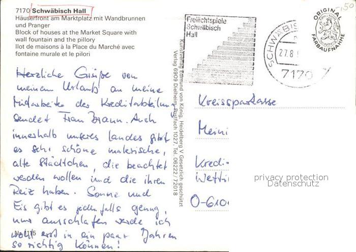 72531597 alte Postkarte Schwaebisch Hall Marktplatz mit Wandbrunnen und Pranger postalisch gelaufen Erhaltung siehe scans [WerneD78 kt116box] KatCode: 11110008127076