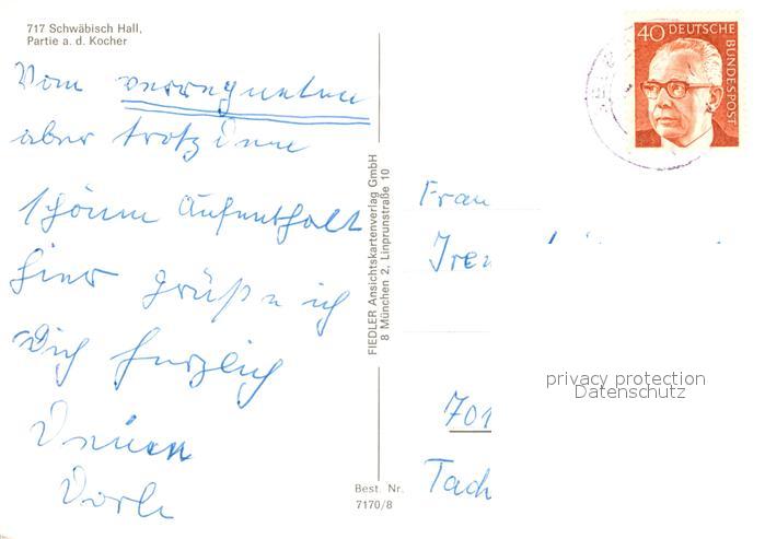 72970347 alte Postkarte Schwaebisch Hall Partie an der Kocher Holzbruecke Altstadt Kirche postalisch gelaufen Erhaltung siehe scans [FriedD77] KatCode: 11110008127076