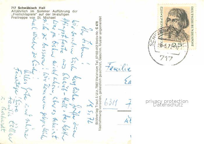72875674 alte Postkarte Schwaebisch Hall St Michael Kirche Salzsiedertanz Rathaus Fluss Geschichte postalisch gelaufen Erhaltung siehe scans [FriedD77] KatCode: 11110008127076