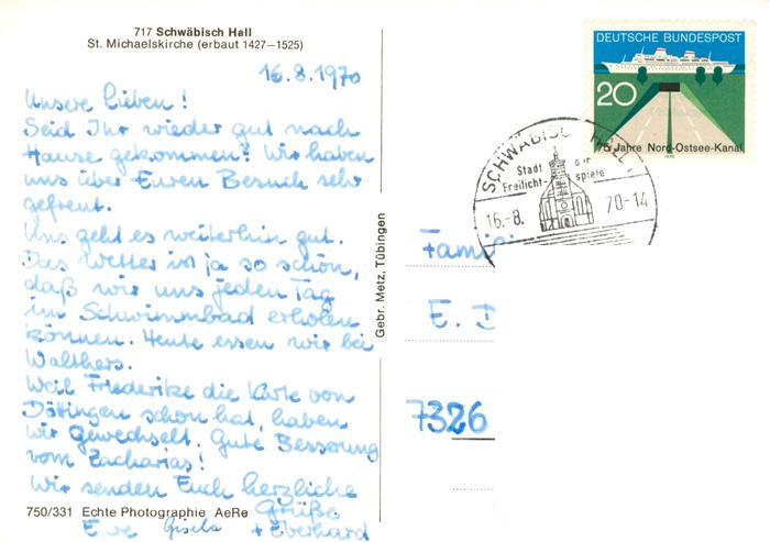 73878334 alte Postkarte Schwaebisch Hall St Michaeliskirche postalisch gelaufen Erhaltung siehe scans [WerneD78] KatCode: 11110008127076