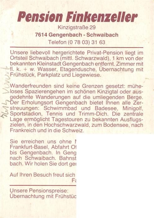 73928542 Schwaibach Gengenbach Pension Finkenzeller postalisch nicht gelaufen Werbekarte (keine Postkarte) Erhaltung siehe scans [FriedD77] KatCode: 11110008317034