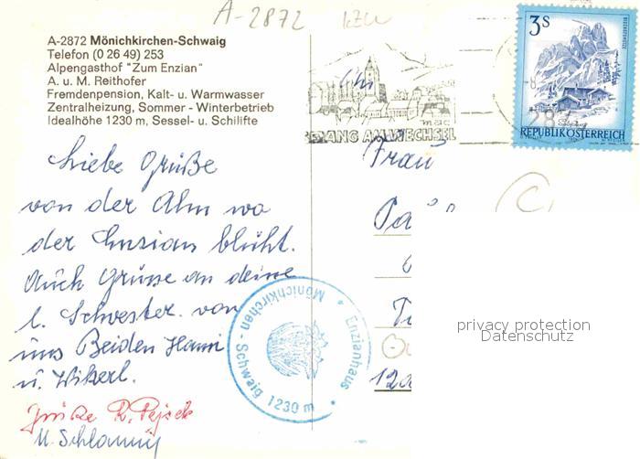 72913911 alte Postkarte Schwaig Moenichkirchen Wegkreuz Alpengasthof zum Enzian postalisch gelaufen Erhaltung siehe scans [KathaD81] KatCode: 11390122031815