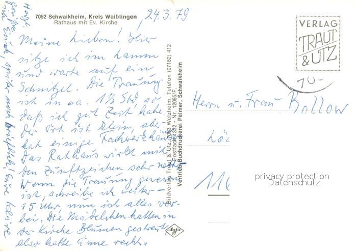 73737685 alte Postkarte Schwaikheim Rathaus m. Ev. Kirche postalisch gelaufen Erhaltung siehe scans [LiesaD40] KatCode: 11110008119068