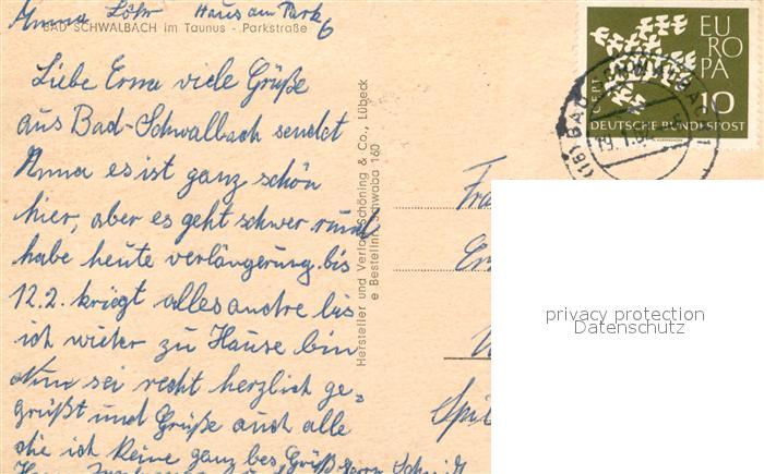 43495085 alte Postkarte Schwalbach Bad Parkstrasse Haus am Park postalisch gelaufen Erhaltung siehe scans [KathaD81] KatCode: 11110006439002