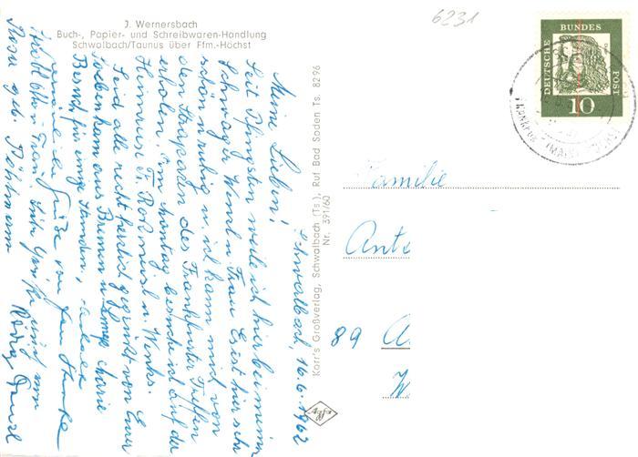 73908330 Schwalbach Taunus Eschborner Strasse Am Taunusblick Bahnstrasse Altes Wasserschloss Am Sandring Roedelheimer Strasse Haus Mutter Krauss postalisch nicht gelaufen Erhaltung siehe scans [WerneD78] KatCode: 11110006436011