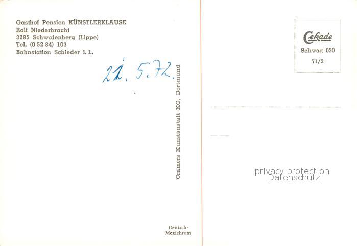73866751 Schwalenberg Gasthof Pension Kuenstlerklause postalisch nicht gelaufen Erhaltung siehe scans [WerneD78] KatCode: 11110005766060