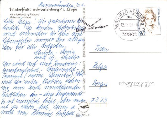 72353970 alte Postkarte Schwalenberg Kuenstlerklause Rathaus Malkasten Markt postalisch gelaufen Erhaltung siehe scans KatCode: 11110005766060