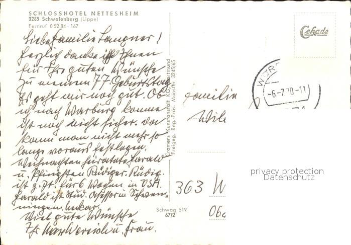 72259561 alte Postkarte Schwalenberg Schlosshotel Nettesheim postalisch gelaufen Erhaltung siehe scans KatCode: 11110005766060