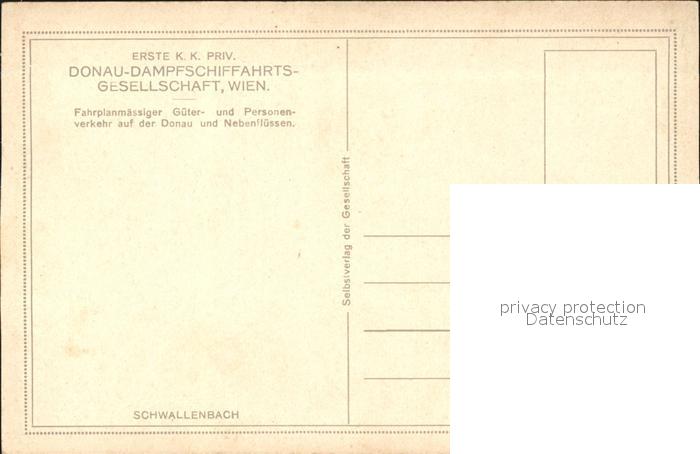 72920809 Schwallenbach Kuenstlerkarte Erste K K Priv Donau Dampfschiffahrtsgesellschaft Wien postalisch nicht gelaufen Erhaltung siehe scans [NatalD47] KatCode: 11390124031344
