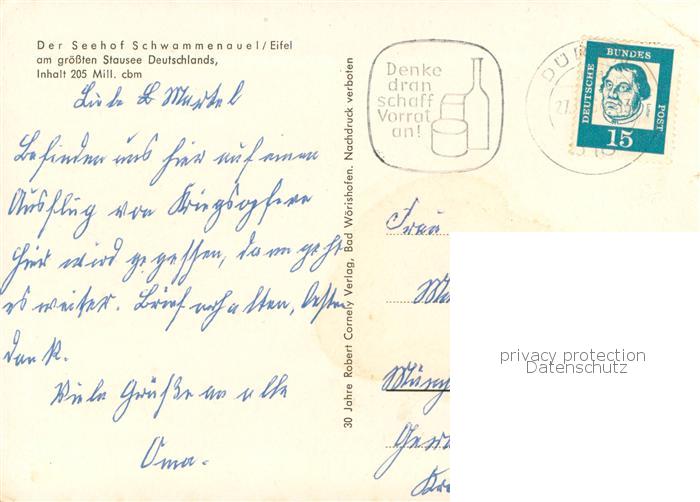 73785298 Schwammenauel Heimbach Seehof Restaurant Terrasse Stausee Sperrmauer Fahrgastschiff postalisch gelaufen Erhaltung siehe scans [FriedD77] alte Postkarte Frie Katcode 11110005358012