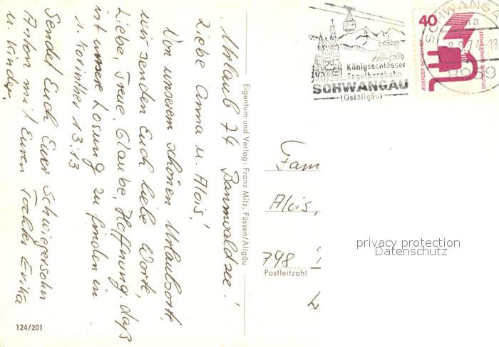 73123393 alte Postkarte Schwangau Bannwaldsee Camping Onkel Toni postalisch gelaufen Erhaltung siehe scans [KathaD81] KatCode: 11110009777169