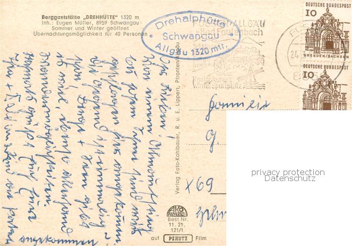 73780663 alte Postkarte Schwangau Berggaststaette Drehhuette postalisch gelaufen Erhaltung siehe scans [WerneD78] KatCode: 11110009777169