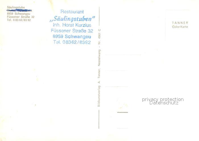 72971357 Schwangau Saeulingstuben Restaurant Terrasse Segelboot Forggensee Tegelbergbahn Schloss Neuschwanstein Wappen postalisch nicht gelaufen Erhaltung siehe scans [FriedD77] KatCode: 11110009777169