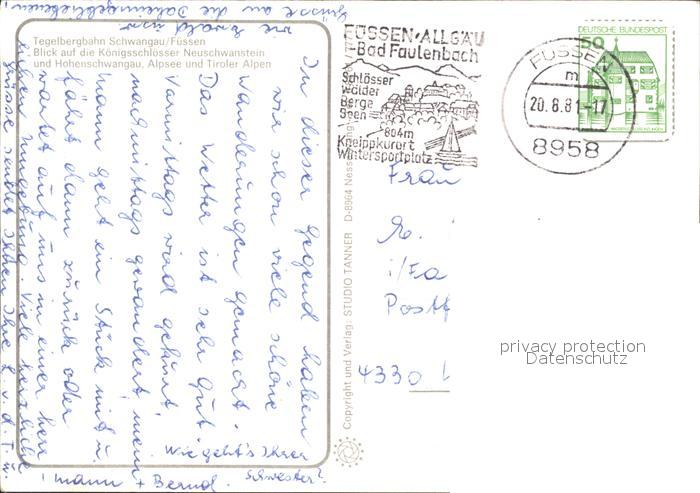 71893002 alte Postkarte Schwangau Tegelbergbahn Koenigsschloesser Neuschwanstein Hohenschwangau Alpsee postalisch gelaufen Erhaltung siehe scans KatCode: 11110009777169