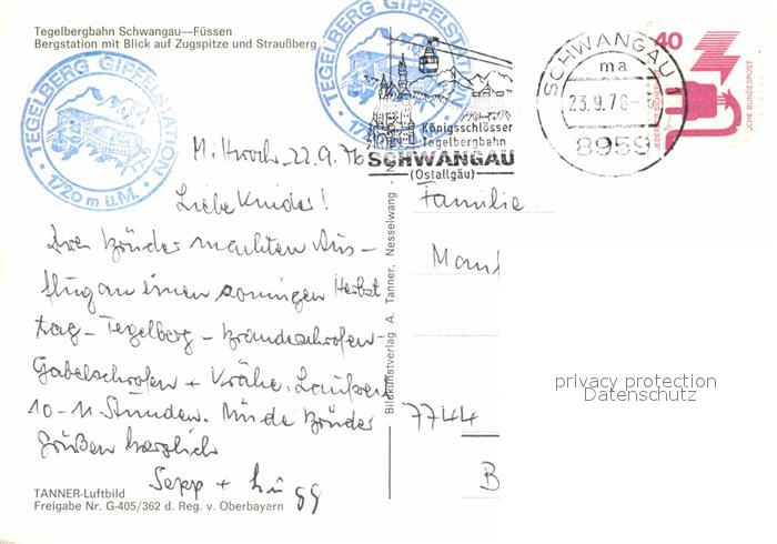 72831997 alte Postkarte Schwangau Tegelbergbahn Schwangau Fuessen Bergstation Zugspitze Straussberg Fliegeraufnahme postalisch gelaufen Erhaltung siehe scans [FriedD77] KatCode: 11110009777169