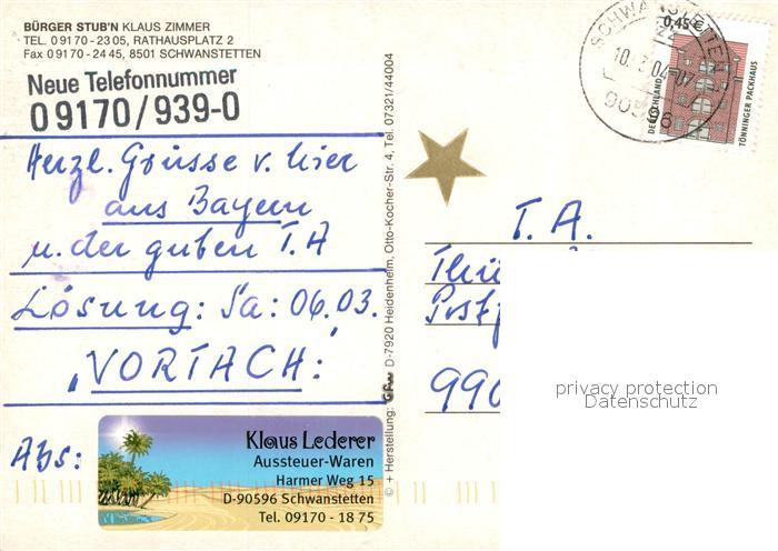 73651029 alte Postkarte Schwanstetten Buerger Stub’n Lokal Restaurant postalisch gelaufen Erhaltung siehe scans [FriedD77] KatCode: 11110009576132