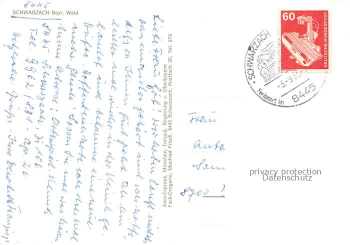74025760 alte Postkarte Schwarzach Niederbayern Panorama Bayerischer Wald postalisch gelaufen Fliegeraufnahme Erhaltung siehe scans [FriedD77] KatCode: 11110009278187