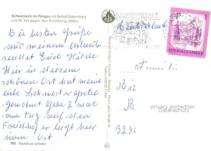 72750620 alte Postkarte Schwarzach Pongau Fliegeraufnahme mit Schloss Schermberg und St. Veit gegen Hochkoenig postalisch gelaufen Erhaltung siehe scans [LiesaD40] KatCode: 11390322050421