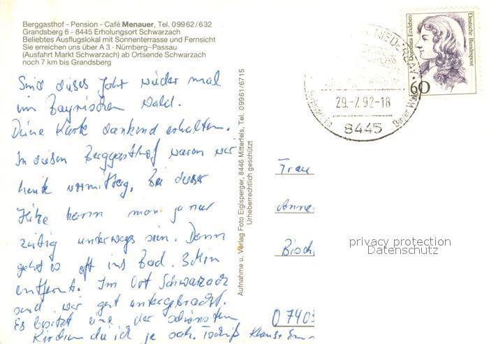 73747579 alte Postkarte Schwarzach Straubing-Bogen Berggasthof Pension Cafe Menauer Gastraeume Hinweisschild postalisch gelaufen Erhaltung siehe scans [WerneD78] KatCode: 11110009278187
