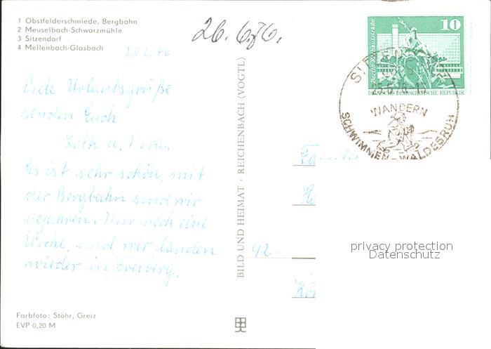 72324702 alte Postkarte Schwarzatal Obstfelderschmiede Bergbahn Meuselbah-Schwarzmuehle Sitzendorf Mellenbach-Glasbach postalisch gelaufen Erhaltung siehe scans KatCode: 11110016073076