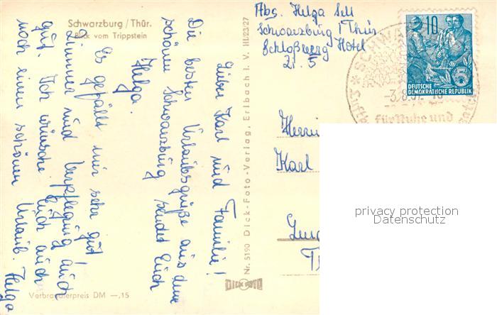 73043644 alte Postkarte Schwarzburg Thueringer Wald Blick vom Trippstein postalisch gelaufen Erhaltung siehe scans [PaolaD17] KatCode: 11110016073082