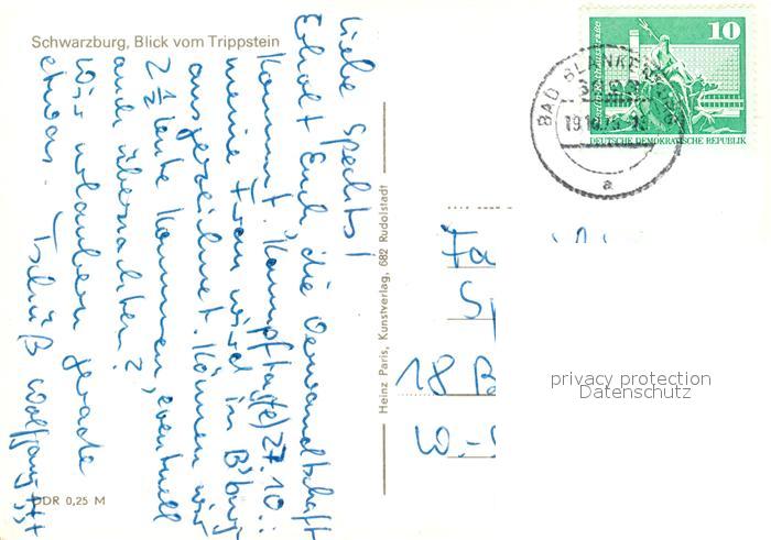 73029098 alte Postkarte Schwarzburg Thueringer Wald Blick vom Trippstein postalisch gelaufen Erhaltung siehe scans [KathaD81] KatCode: 11110016073082