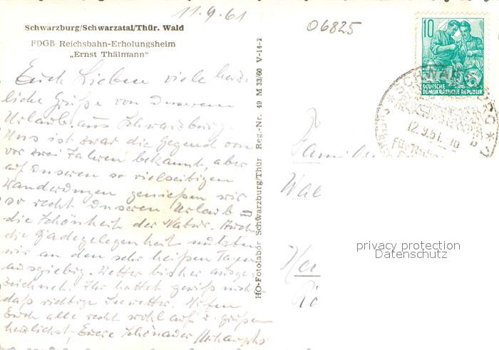 72968677 alte Postkarte Schwarzburg Thueringer Wald FDGB Reichsbahn Erholungsheim Ernst Thaelmann im Schwarzatal postalisch gelaufen Erhaltung siehe scans [FriedD77] KatCode: 11110016073082