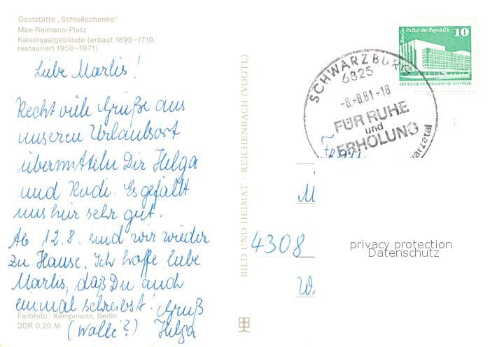 73025606 alte Postkarte Schwarzburg Thueringer Wald Gaststaette Schlossschenke Max Reimann Platz Kaisersaalgebaeude postalisch gelaufen Erhaltung siehe scans [KathaD81] KatCode: 11110016073082
