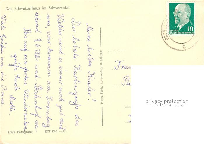 73593316 alte Postkarte Schwarzburg Thueringer Wald Gaststaette Schweizerhaus im Schwarzatal postalisch gelaufen Erhaltung siehe scans [FriedD77] KatCode: 11110016073082