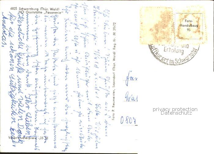 71982552 alte Postkarte Schwarzburg Thueringer Wald HO Gaststaette Fasanerie postalisch gelaufen Erhaltung siehe scans KatCode: 11110016073082