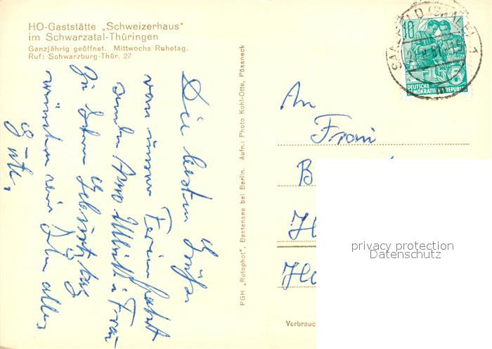 73135752 alte Postkarte Schwarzburg Thueringer Wald HO Gaststaette Schweizerhaus im Schwarzatal postalisch gelaufen Erhaltung siehe scans [FriedD77] KatCode: 11110016073082