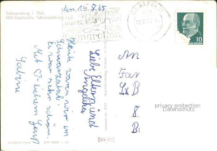 72474175 alte Postkarte Schwarzburg Thueringer Wald HO Gaststaette Schweizerhaus Terrasse postalisch gelaufen Erhaltung siehe scans KatCode: 11110016073082